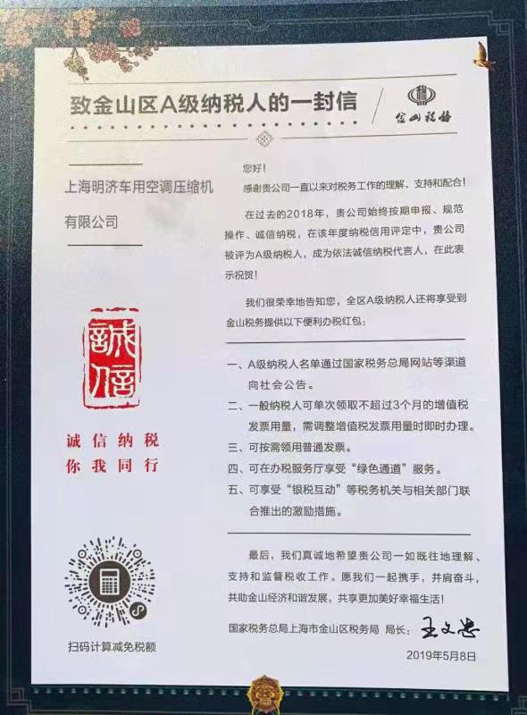 上海明濟公司自2011年成立以來,始終堅持“誠信贏天下”的經(jīng)營理念,依法納稅且獲得上級單位及政府的認可,2019年度,公司再次評為金山區(qū)A級納稅人的殊榮。